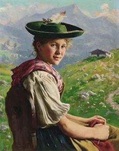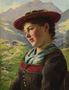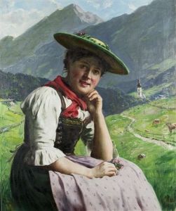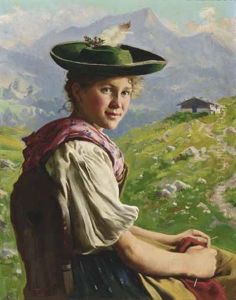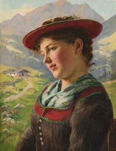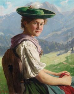 Lachelndes Madchen In Tracht Vor Gebirgskulisse, Uber Ihre Linke Schulter Blickend