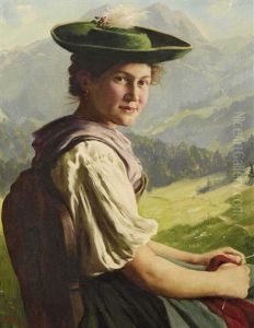 Portrat Eines Strickenden Madchens Vor Der Kulisse Eines Alpentals