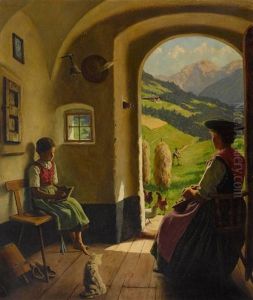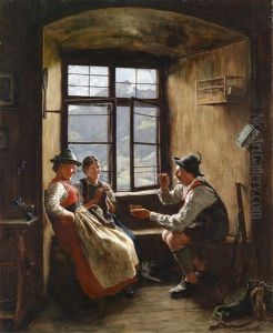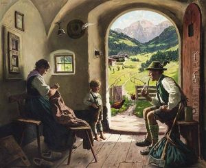 Musestunde. Bauernstube Mit Zitherspieler, Lauschender Frau Und Strickendem Madchen Neben Feuerstelle