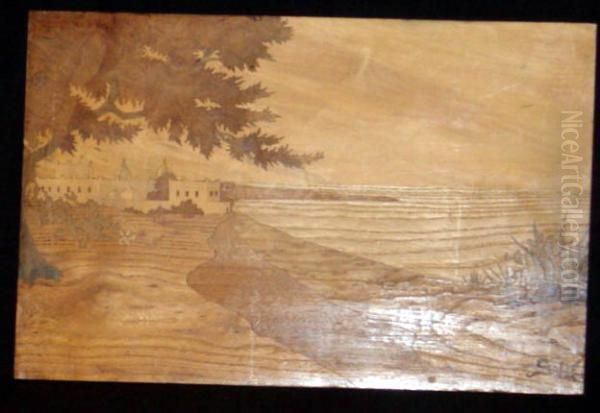 Panneau Decoratif A Fond De Marqueterie. Decor D""un Paysage De Bord De Mer.