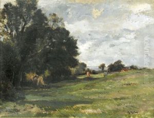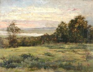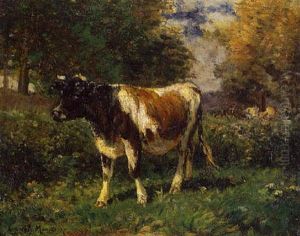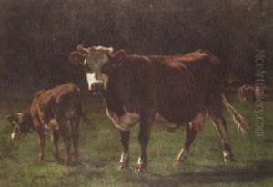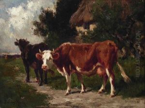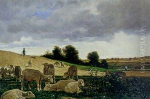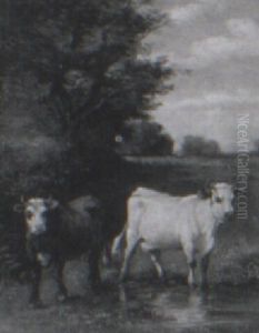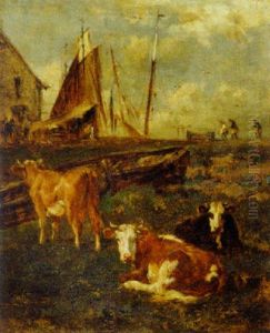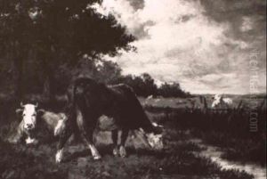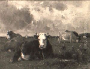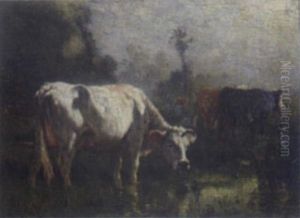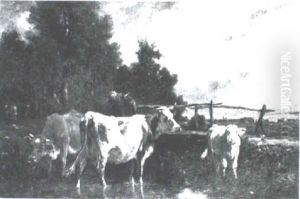 Cows At A Watering Spot, Others Lying In A Pasture In The Background