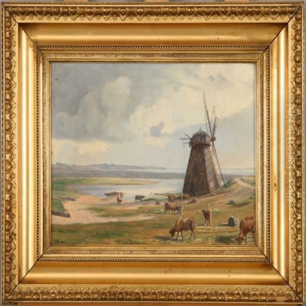 Landscape With Grazing Cows By A Mill. Signed Em 1901