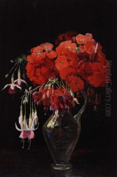 Fuchsias And Geraniums, Flowerpiece In Glass Pitcher