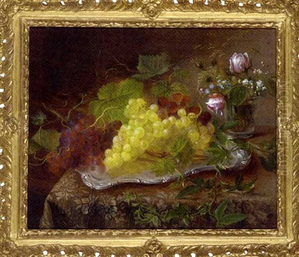 Grapes On A Silver Platter With Summer Flowers In A Glass Alongside