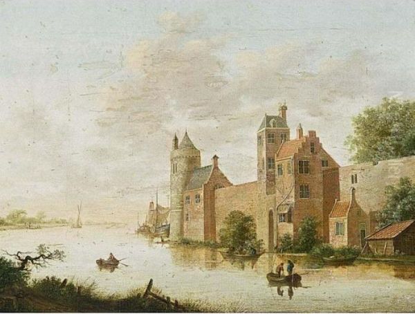 A River Landscape With Figures In Boats Near The Walls Of A Town
