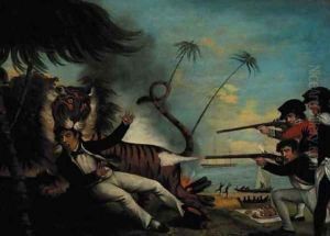 Portrait of a Gentleman, three-quarter-length, in a brown suit, holding a hat and gun, seated by a tree