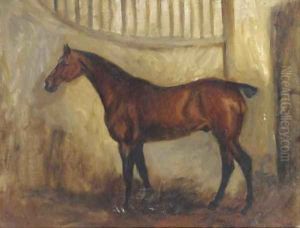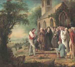 A gentleman and his hunter, a church spire beyond, in an extensive landscape