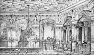 Portrait of a lady, bust-length, in profile to the left, wearing a black coat with white ruffed collar