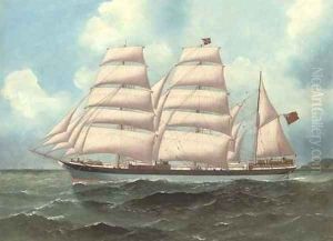 The three-masted barque Anglo-Norman under full sail in coastal waters