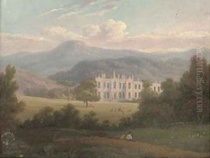 A wooded landscape with figures and a herdsman with a flock of sheep in a clearing, a castle beyond