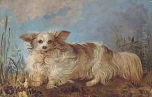Portrait of a lady, seated three-quarter-length, in a white dress and mop hat with a blue ribbon