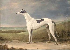 A prize greyhound in an extensive landscape, a river beyond
