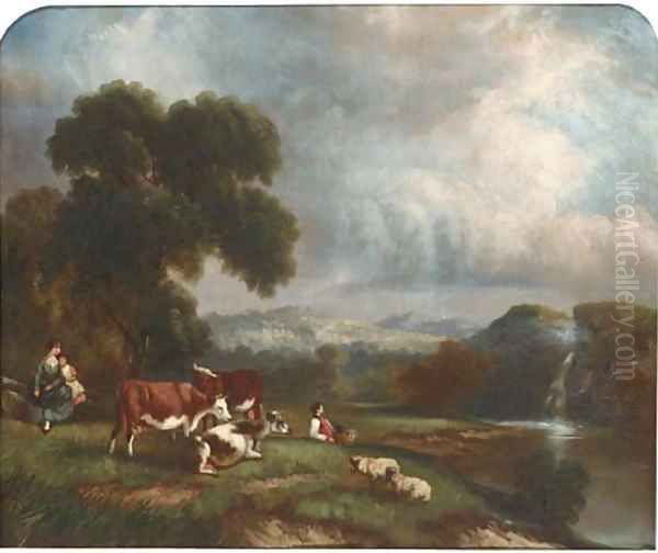 Cattle watering in a wooded landscape; and Figures resting by a waterfall with cattle and sheep