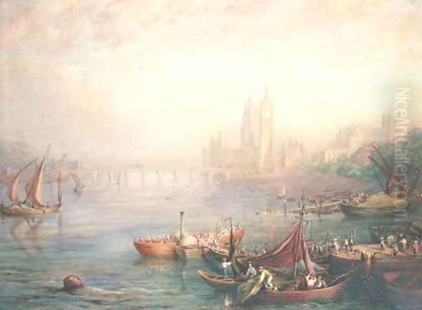 Figures on barges in a capriccio of London, with a view of the Houses of Parliament, St Margarets Westminster and Westminster Abbey