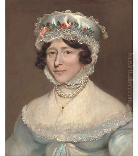 Portrait of a lady, bust-length, in a blue dress and a lace and silk bonnet with a floral border
