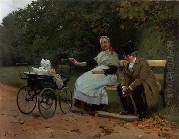Parkscene Med Herre Og Kvinde Med Barnevogn
