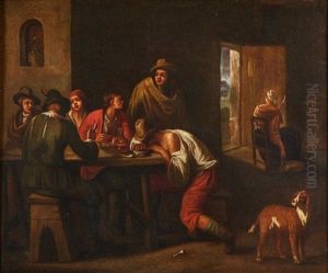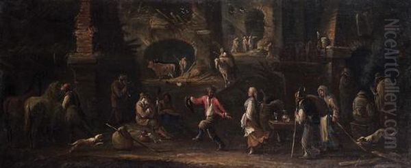 Scena Popolare Con Soldati All""osteria, Giovane Che Conduceuna Capra E Figure Presso Una Fontana;