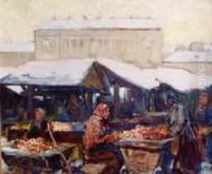 Winter Town Scene With Market Stalls