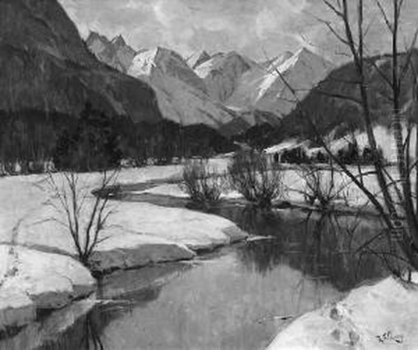 F. "winterlicher Flusslauf In Den Alpen". Sign