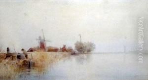 Fischer Am Ufer Vor Windmuhle U. Untergehender Sonne