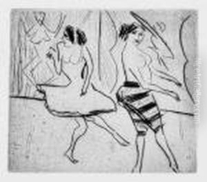 Zwei Nackte Madchen In Flacher Wanne (+ Elbkahne Vor Gelben Hausern, Dresden, Verso)