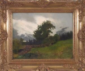 Blick Von Einer Wiese Uber Baume Auf Einen See Vor Wolkenverhangenen Bergen