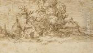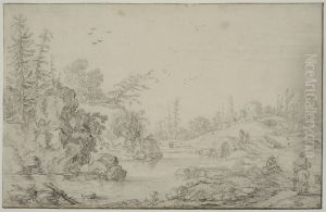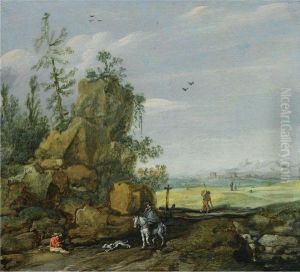A Rocky Wooded Landscape With Christ On The Road To Emmaus