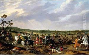 An Extensive Landscape With A Hunting Party Halting By A Classical Fountain