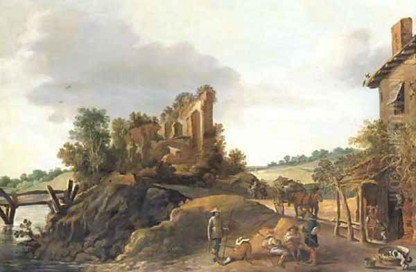 An extensive landscape with soldiers resting by a tavern, a horse and cart and other figures on a road and a ruin on a hilltop beyond