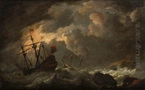 Dutch Shipping In Rough Seas Off A Rocky Coastline