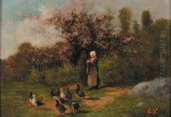 "la Gardienne D'oie Sous Les Pommiers Enfleurs" Huile Sur Panneau Signee Des Initiales En Rouge En Bas Adroite E. V. 31,8 X 46 Cm