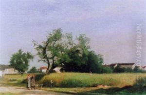 Feldlandschaft Mit Bauern Bei Der Heuernte