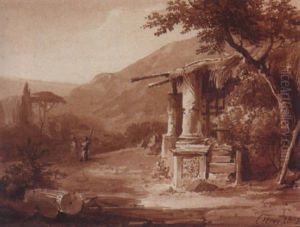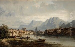 Gebirgslandschaft Mit Wildbach, Brucke Und Personenstaffage
