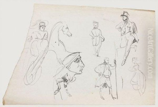 Etude D'elegants, D'une Femme En Amazone Sur Un Cheval, D'une Tete D'oriental De Profil