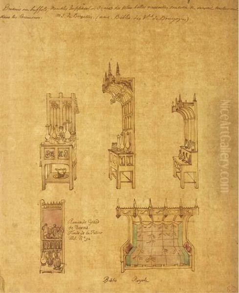 Quatre Etudes De Dressoirs Et Un Lit Medieval
