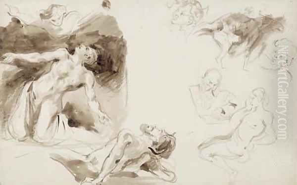 Un ange apparat à un saint agenouille, un homme nu allonge, une femme nue assise, trois tetes et un chat