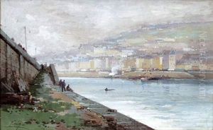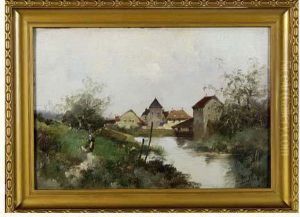 A River Scene With Bateaux Lavoirs And Figures On The Bank