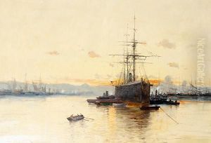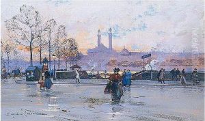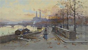 A River Scene With Bateaux Lavoirs And Figures On The Bank