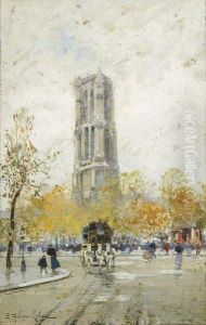 A Busy Paris Street With The Church Of St. Michael Beyond
