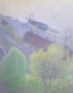 However, Jansson's fascination with the urban environment of Stockholm led him to break away from these conventional themes. He became well-known for his 'blue period' during the late 1890s and early 1900s, in which he painted the cityscapes and waterways of Stockholm in a distinctive blue tone, a technique that highlighted the nocturnal mood and brought a mystical quality to his work. His painting 'Riddarfjärden' is one of the famous works from this period, showcasing his innovative use of color and light.