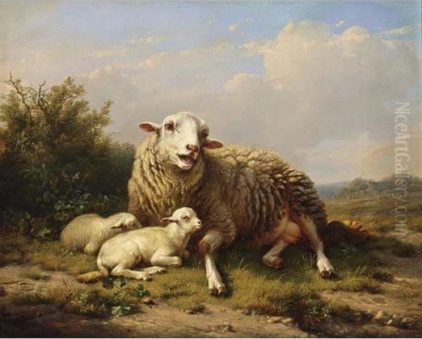 A Sheep And Two Lambs Resting In A Summer Landscape