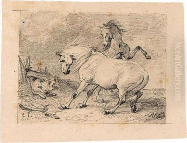Two Horses Frightened By A Wolf