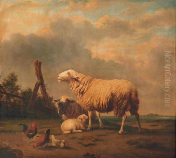 Two Sheep With A Lamb And Three Chickens In A Landscape