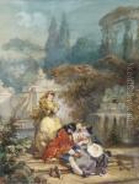 Les Amants Surpris: Deux Amants Assis Sur Une Marche Dans Un Jardinobserves Par Une Femme Portant Un Masque; Lemoisne No. 1245.