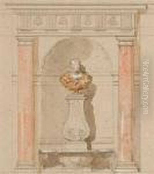 Projet De Vestibule Pour Le Chateau De Ferrieres, Avec Le Busted'un Empereur Romain Dans Une Niche