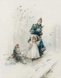 Girl Ina Lilac-coloured Dress With Bouquet Of Flowers And Basket Offlowers