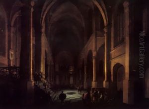 A Church Interior With A Figure Preaching