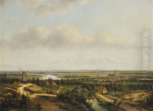 A Panoramic River Landscape With A Windmill And Figures