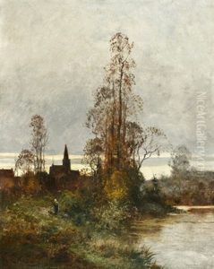 A Winter Landscape With Skaters On A Frozen Waterway (+ A Summer Landscape With Boats On A River; Pair)