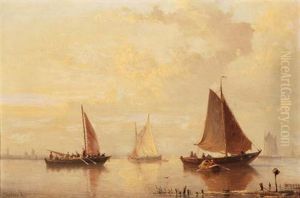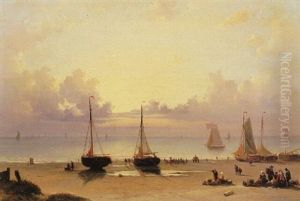 Aufliegende Segelboote An Hollandischer Kuste. Vorn Zahlreiche Fischer, Ihrem Tagewerk Nachgehend